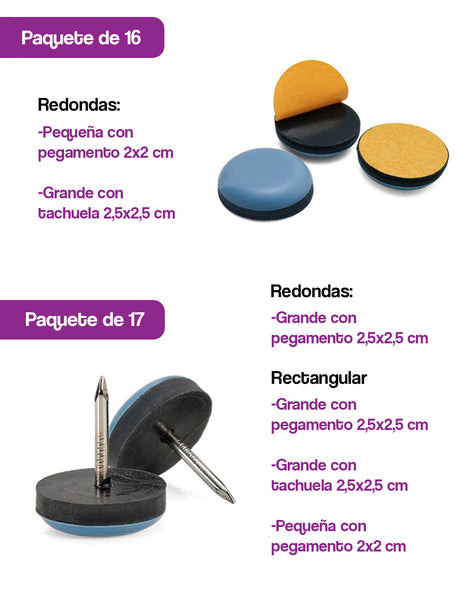Para instalar limpia las superficies a las que se pegarán los deslizadores, una vez seca coloca suavemente el control deslizante en la parte inferior de la pata del mueble y presiona firmemente.