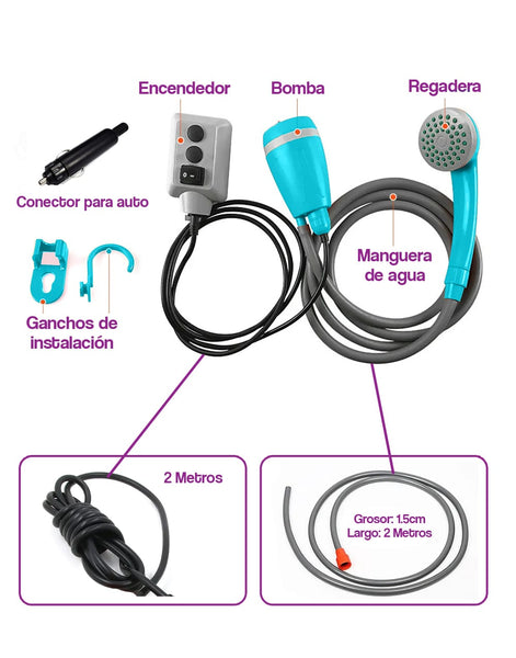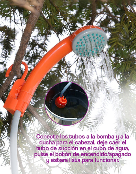 Ducha de mano al aire libre que transforma un fregadero o cubo de agua en un chorro de ducha instantánea. Perfectamente agradable para ducharse, cuenta con un gancho estilo S que le permite funcionar de forma segura por encima de la cabeza. Compacta, portátil y pequeña, permite entrar discretamente en el equipaje, mochila o maletero del coche para ir de excursión, camping, baño de los niños y la limpieza de mascotas. Conecte los tubos a la bomba y a la ducha para el cabezal, deje caer el tubo de succión en el cubo de agua, pulse el botón de encendido/apagado y estará lista para funcionar.